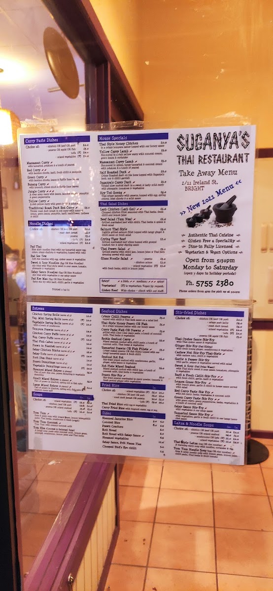 Welcome to Suganya's Thai Restaurant, a delightful culinary gem nestled in Bright, VIC. The menu showcases an array of authentic Thai dishes that promise to tantalize your taste buds. From the rich and fragrant Red Curry to the zesty Green Curry and the indulgent Massaman Curry, each curry paste dish is a celebration of flavors. For stir-fry lovers, the Cashew Nut StirFry Thai Style and classic Sweet & Sour are must-tries.